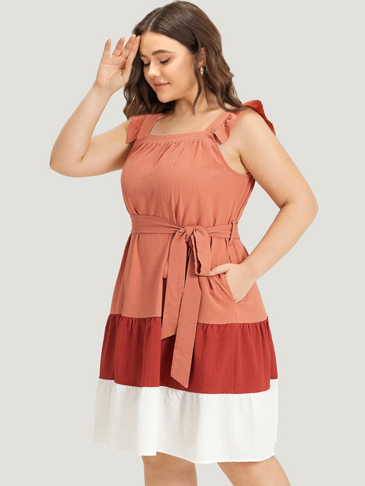 Contrast Ruffles Pocket Belted Square Neck Cami Dress
