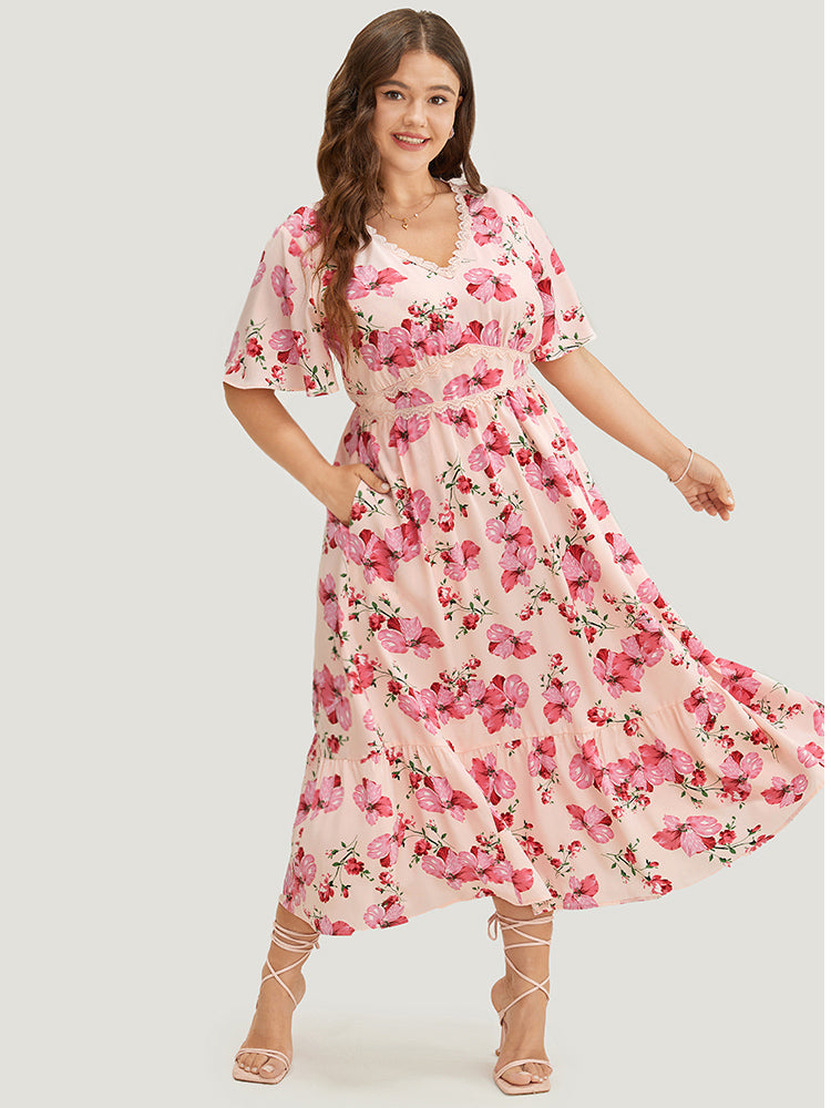 Floral Print Lace Pocket Ruffle Hem Empire Waist Dress