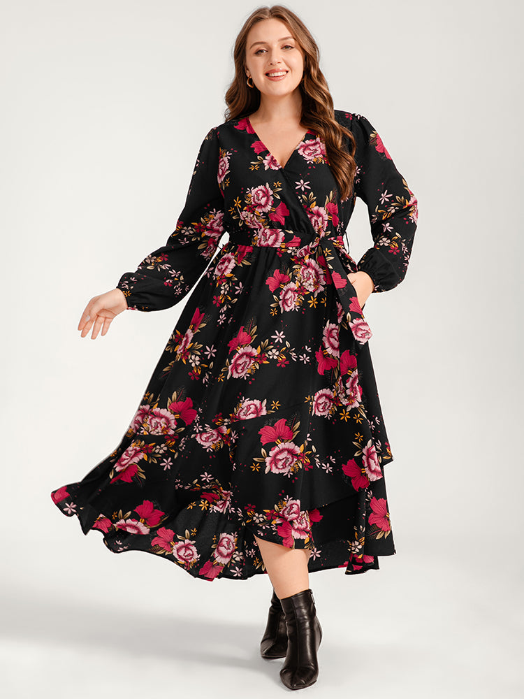 Floral Ruffle Lantern Sleeve Pocket Belted Asymmetrical Hem Dress
