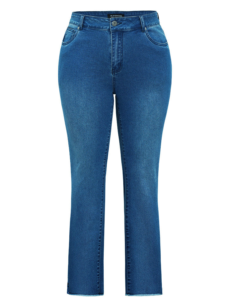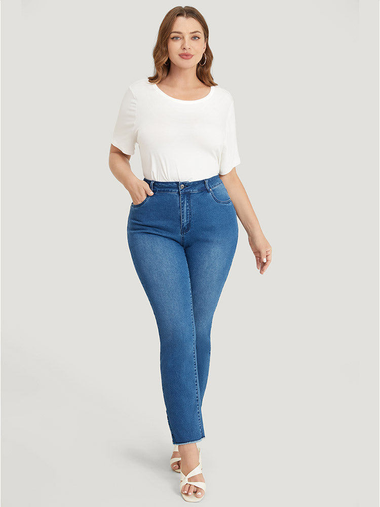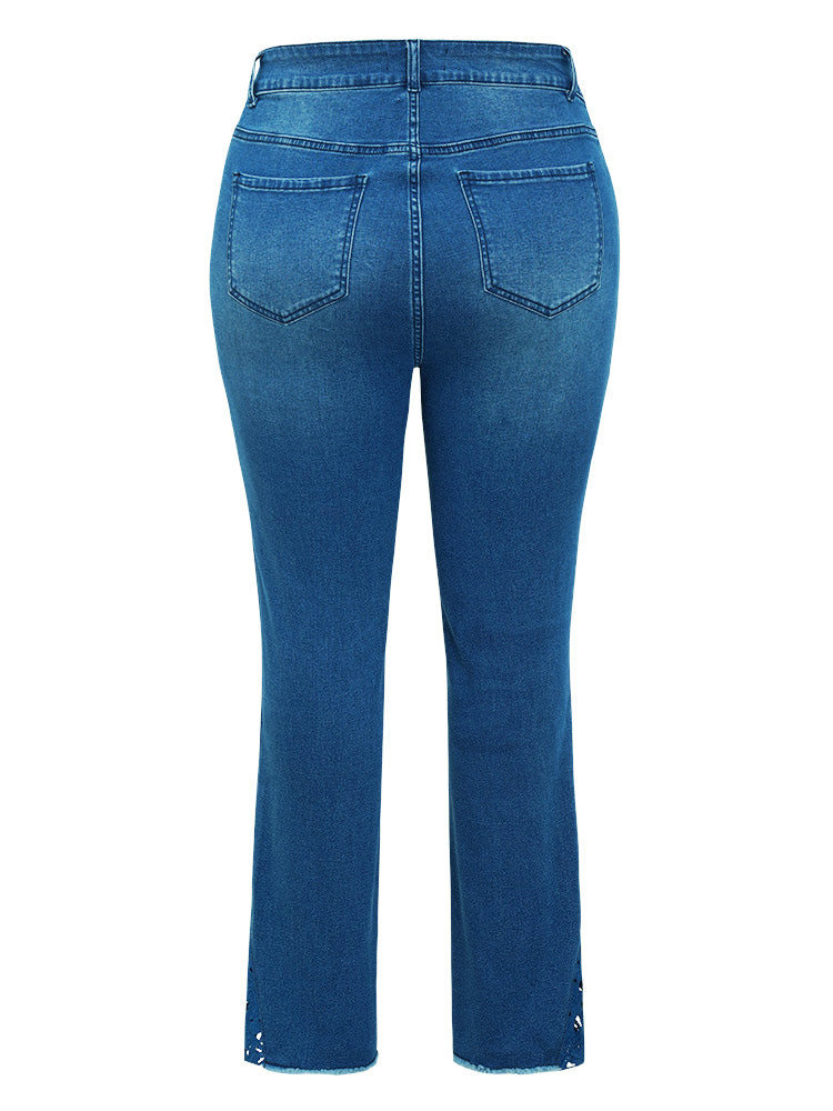 Very Stretchy High Rise Medium Wash Lace Insert Raw Hem Jeans